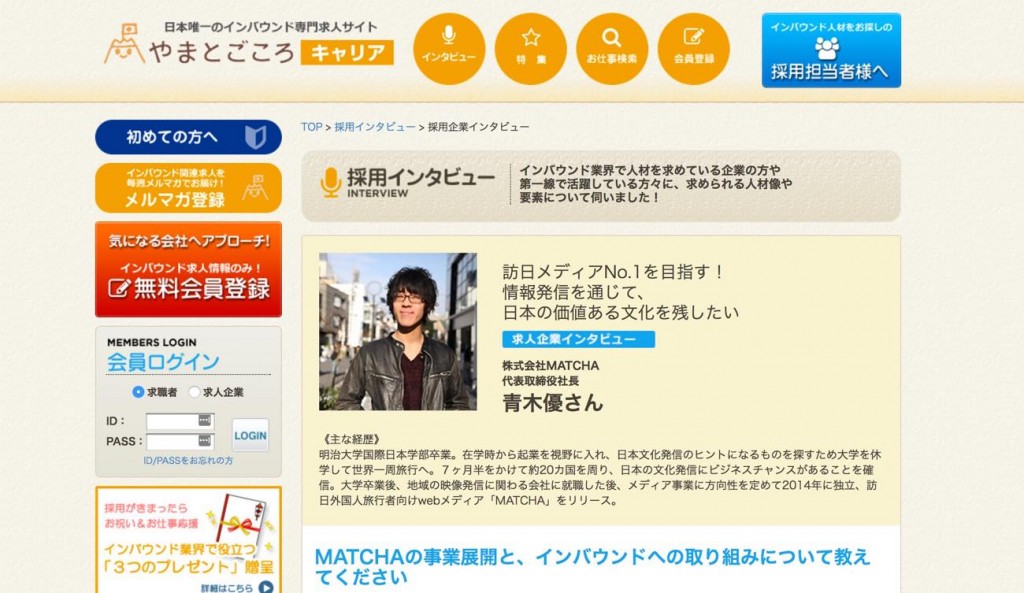 知り合いの会社の方がやまとごころキャリアから10人以上人を採用していると言っていて、MATCHAも今回載せてもらうことに。