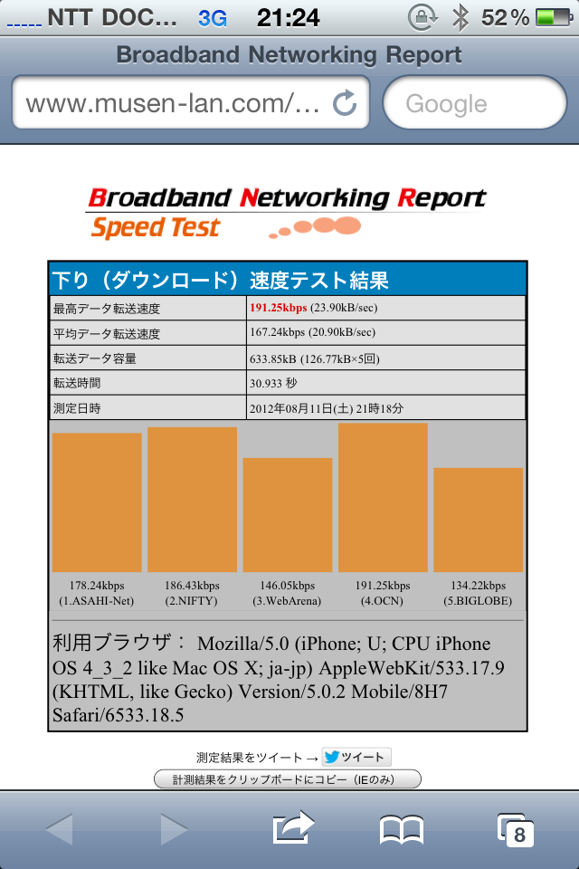 最高転送速度191kbps、平均データ転送速度167kbps