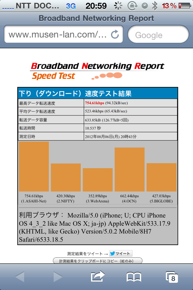 最高転送速度754kbps、平均データ転送速度523kbps