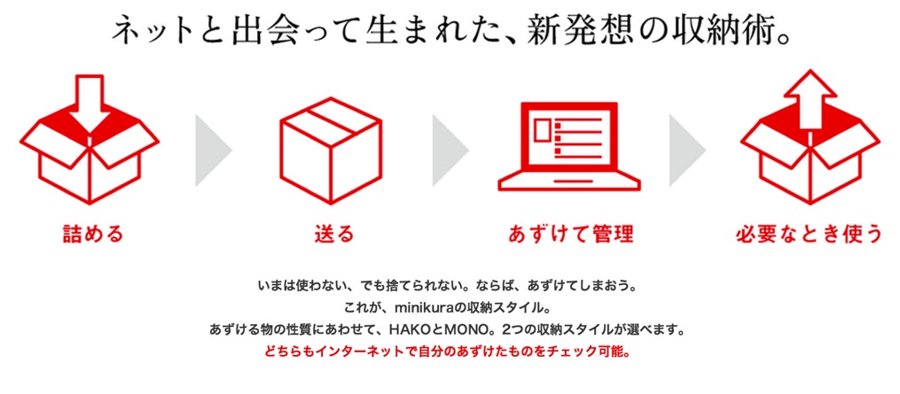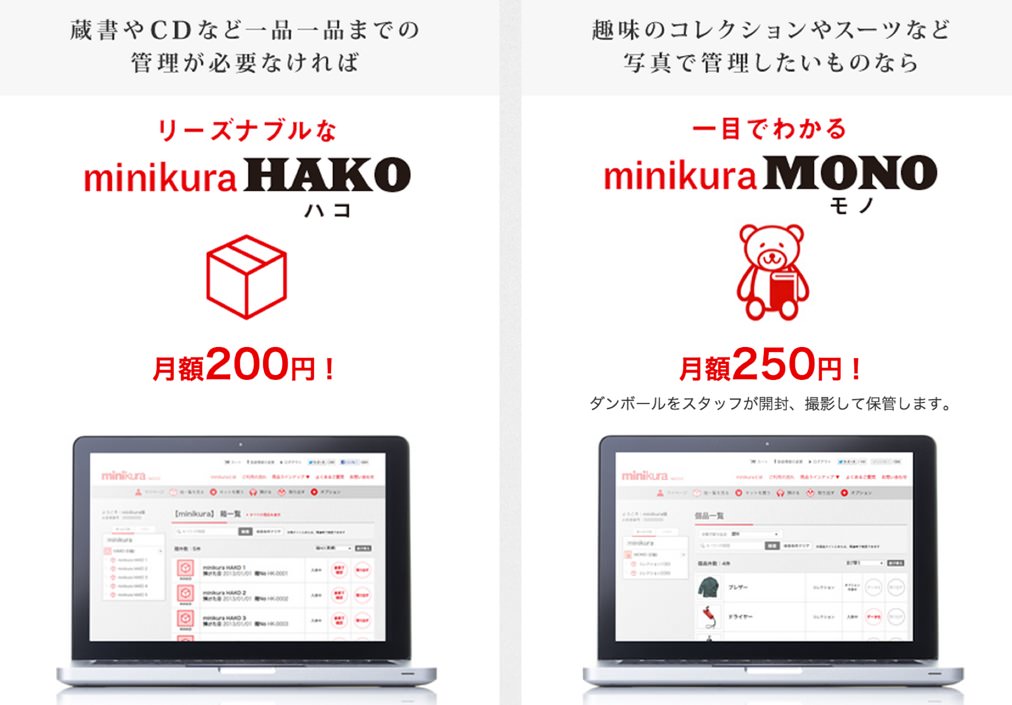 今回紹介するサービスは、データではなく、「物」のクラウド化を担うサービス。これ、中々面白いので、紹介したいと思います。ミニクラとは、「今使わない、捨てられないものを預ける」事ができるサービスです。月額200円という値段で預ける事が可能。季節外れのスーツを持っている人や、物に溢れてる人にとって、便利なサービスです。
