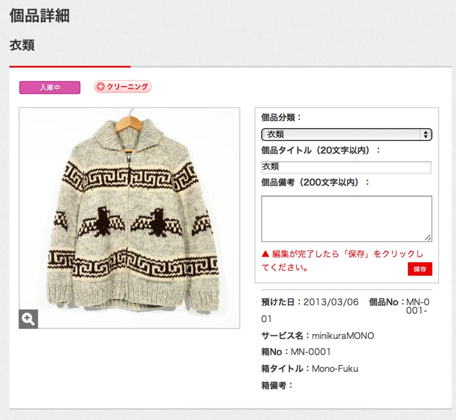 頼んだのは、MONOとHAKO。HAKOはただ荷物を預けるだけ。MONOは、実際に預けながらも、Web上で預けたものを確認することができ、一点のみの返送も可能。洋服の場合、webから申し込めるオプションサービスでクリーニングしてもらうこともできます。