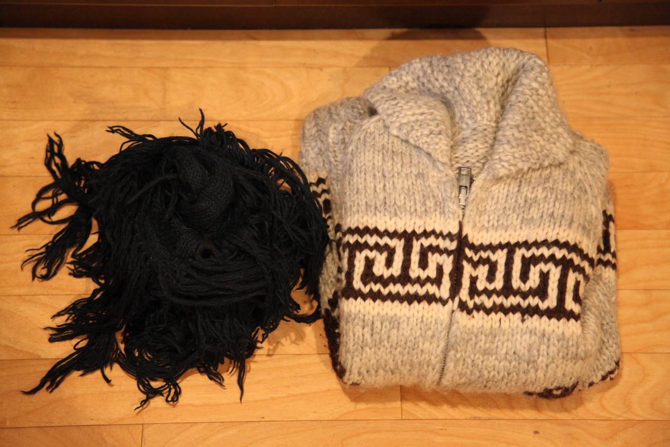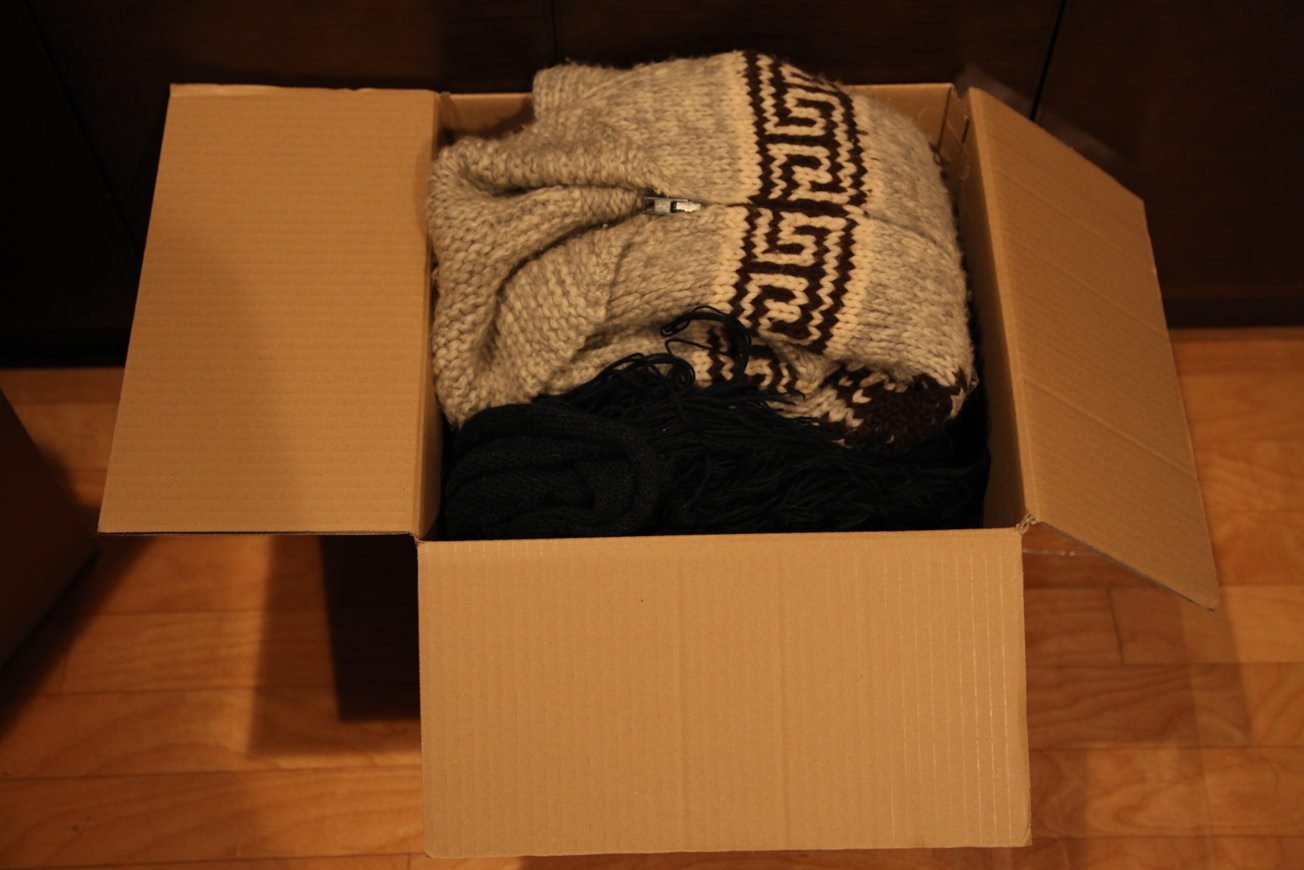 ガムテープで組み立てて、預けたい荷物を入れる。MONOには、もう着ていない服を入れました。あと、マフラー。